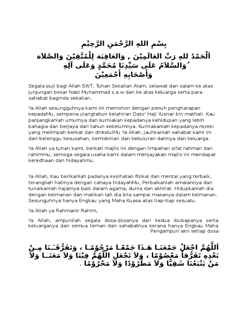 Neelofa PU Riz Haris Ismail Muhammad Bilal pasangan selebriti Artikel. Berikut dikongsikan teks bacaan doa selamat pembukaan majlis perhimpunan dan penutup majlis dalam rumi dan jawi yang boleh anda bacakan ketika berada dalam program. Doa Ibu Bapa 4 Doa Murah Rezeki 8 Doa Pagi 10 Doa Selamat 19 Doa Selepas Solat 15 Ucapan Belasungkawa 5 Ucapan Hari Bapa 3 Ucapan Hari Guru 2 Ucapan Hari Ibu 2 Ucapan Hari Lahir 23 Ucapan Hari Raya 7 Ucapan Maulidur Rasul 2 Ucapan Merdeka 4 Ucapan Pengantin Baru 7 Ucapan Pengerusi Majlis 1 Ucapan Penghargaan 4.